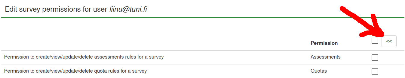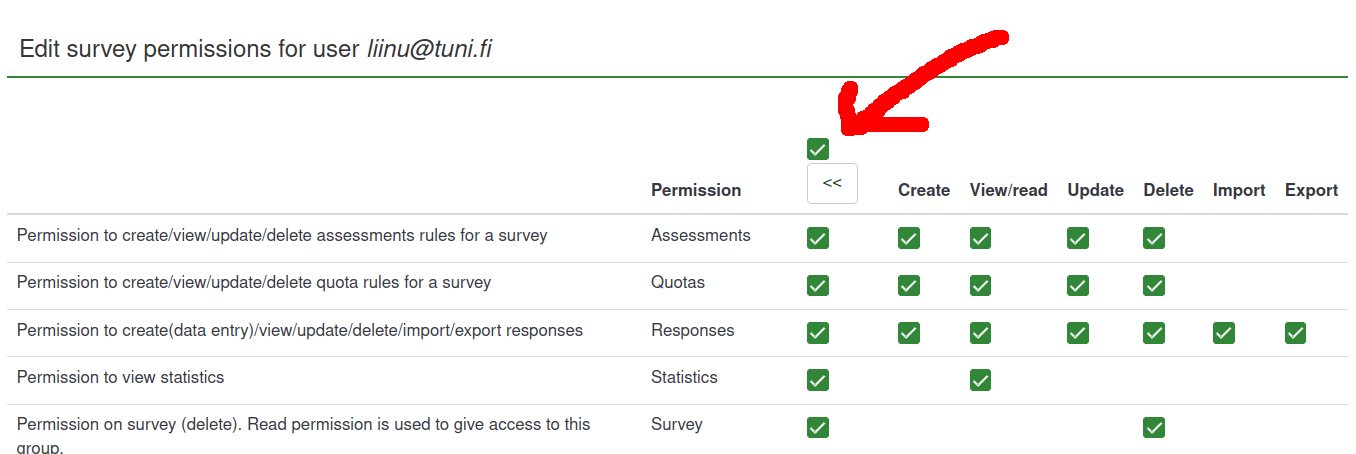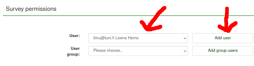 If you have several surveys that should have same permissions, we can make a survey group for you. Contrary to the user groups, they are "real": you can add or remove surveys to a group, and they will get and lost permissions given to the survey group. Ask it-helpdesk@tuni.fi for more.